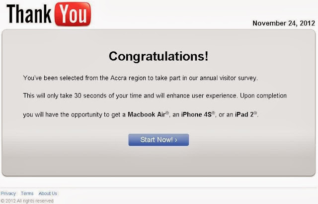 Ok, that’s not the worst part. As part of the process for you to start earning money, you are required to complete one of the top ten offers. The cost ranges from free to a few dollars. Meanwhile, most of those offers, together with the ads don’t lead to real offers or ads. In fact, most of them lead to the same page where you are asked to take a survey for an opportunity to get a Macbook Air®, an iPhone 4S®, or an iPad 2®. It does not matter what the link was advertising!!!